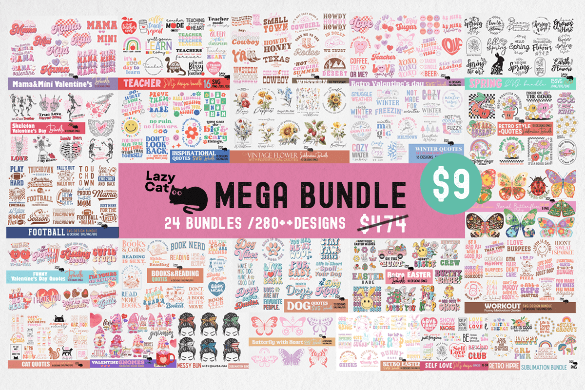 Unleash your creativity with the Lazy Cat Mega Bundle, featuring over 280 high-quality graphics designed to cater to all your crafting needs! This versatile collection includes themed designs for winter, Valentine’s Day, spring, Easter, and delightful graphics featuring cats and dogs. Perfect for various crafting projects, this bundle offers a fantastic opportunity to save big while expanding your design library!